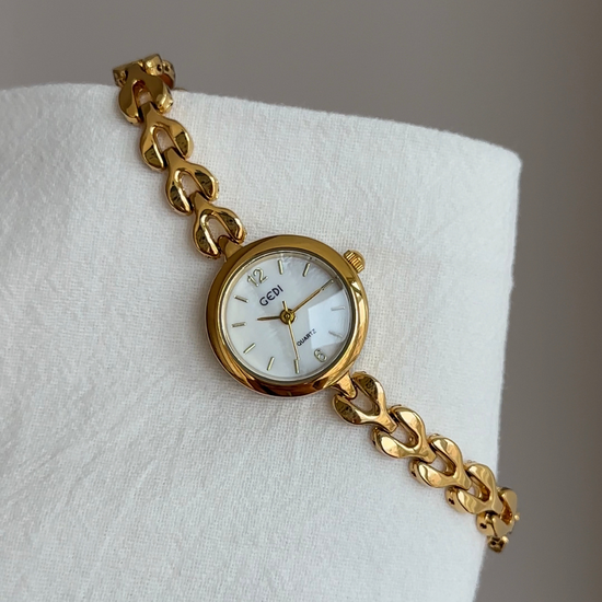 Golden Bloom bangle watch combines minimalist design with a sleek gold-tone case and pristine white dial. This quartz timepiece features an adjustable bracelet for comfort and versatility. Perfect for casual and formal occasions, it offers affordable luxury for the modern woman.