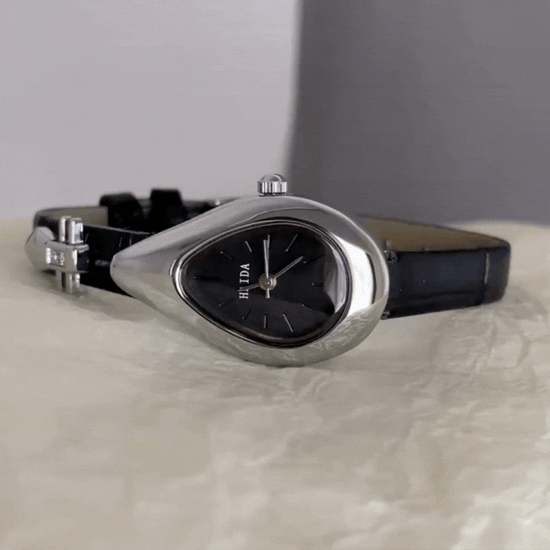 Dit quartzhorloge voor dames heeft een sierlijke druppelvormige wijzerplaat, omhuld door een strak zilverkleurig frame, en gecombineerd met een klassieke zwarte leren bandHet vloeiende silhouet vormt een zacht contrast met het moderne minimalisme, waardoor een look ontstaat die zowel vrouwelijk als ingetogen krachtig is.