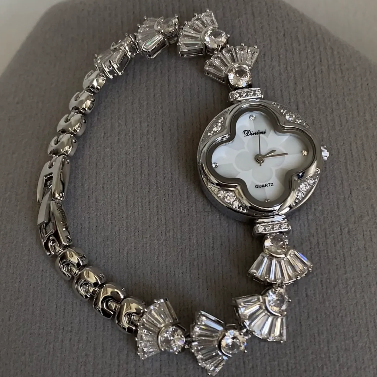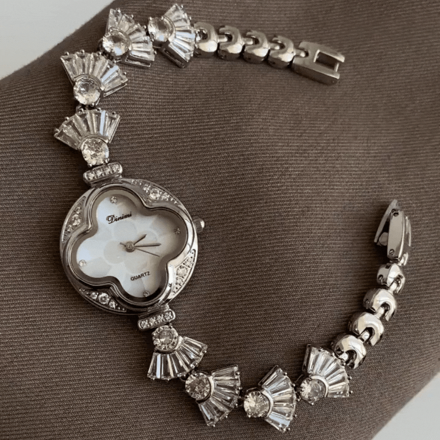 Dit prachtige horloge heeft een waaierontwerp met sprankelende waterdiamanten rondom een klavertjevier wijzerplaat. De elegante esthetiek wordt gecompleteerd door een verfijnd quartz-uurwerk, dat zowel schoonheid als precisie garandeert. Een perfect accessoire om elke gelegenheid een vleugje verfijning en charme te geven.