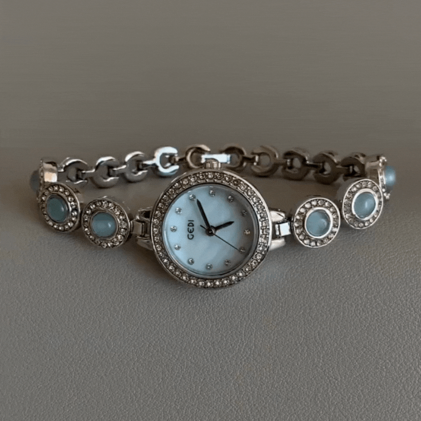 Dit prachtige horloge heeft een delicate zilveren armband versierd met parelaccenten en fonkelende diamanten. De ronde blauwe wijzerplaat voegt een vleugje verfijning toe en combineert elegantie en stijl naadloos.