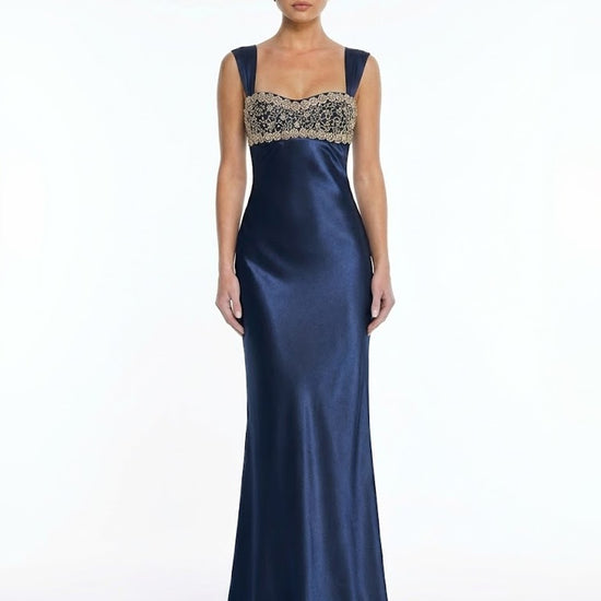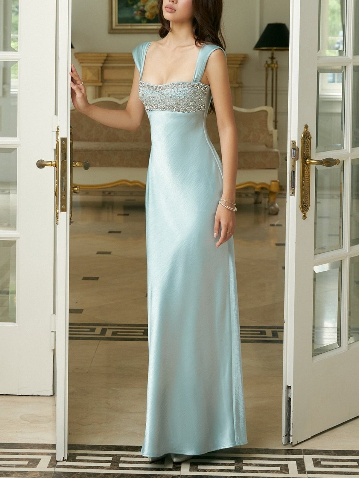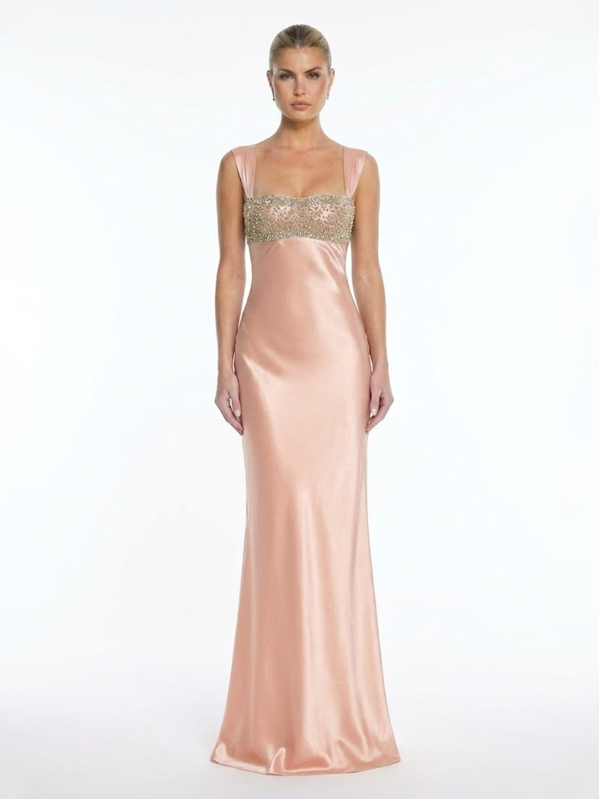 Elevate your evening in this sophisticated and lustrous creation. This piece features an intricate embroidered floral detail across the bust, perfectly complemented by a sleek square neckline and supportive wide straps. Crafted from a smooth material with a luxurious sheen, the silhouette flows into a graceful floor-length finish for a timeless, statuesque look.