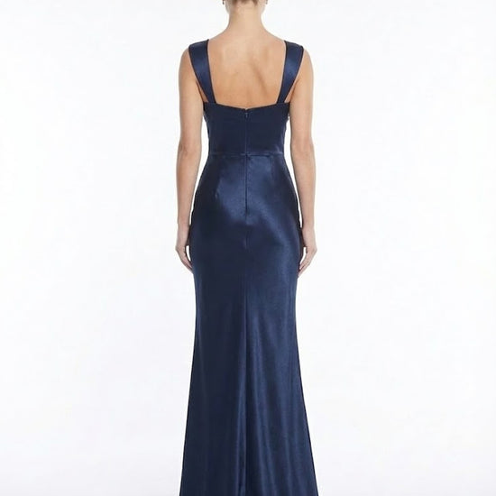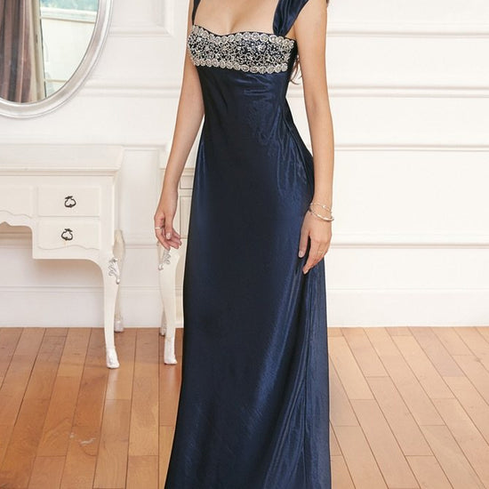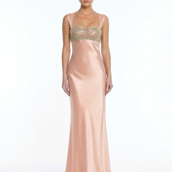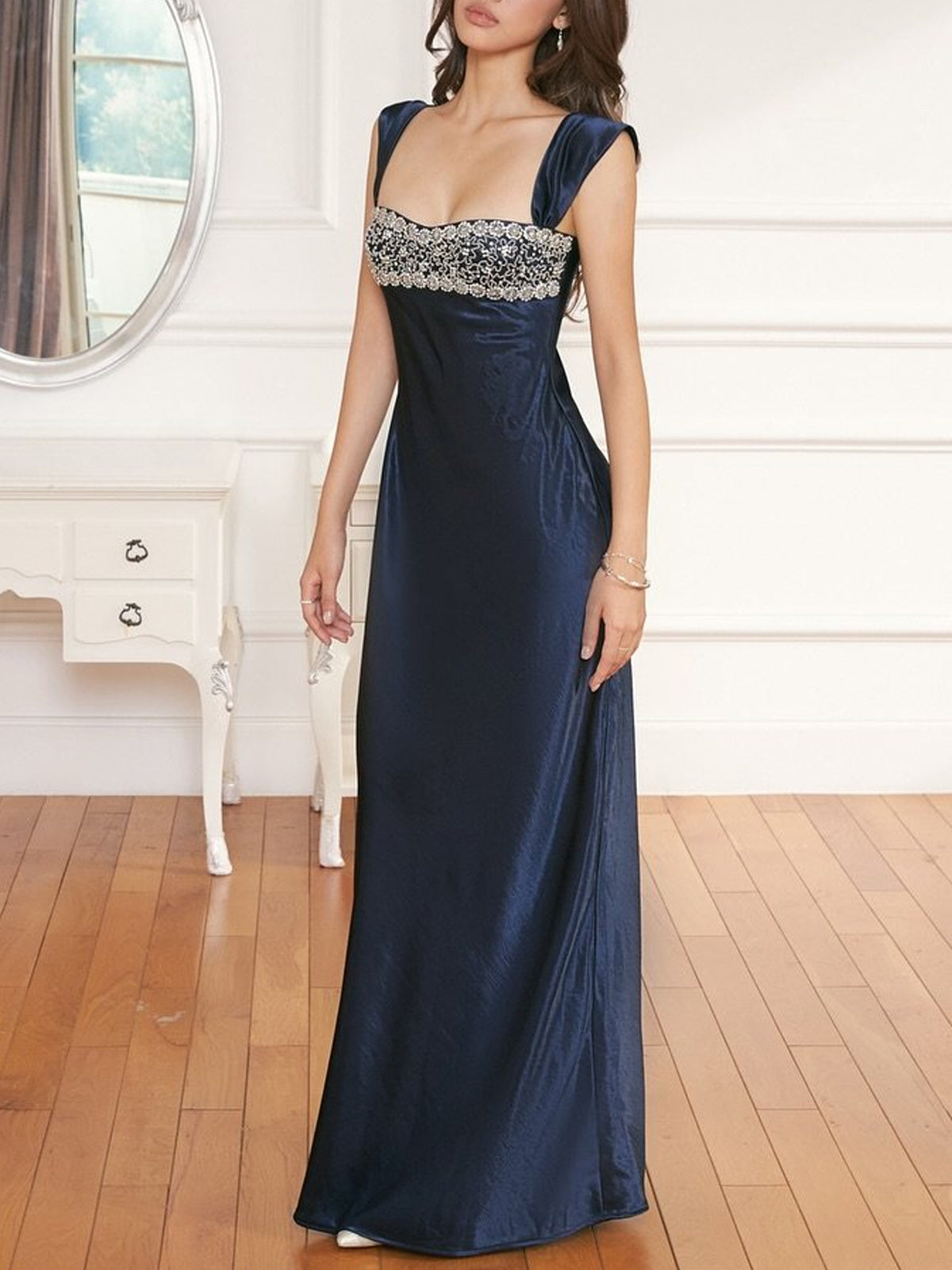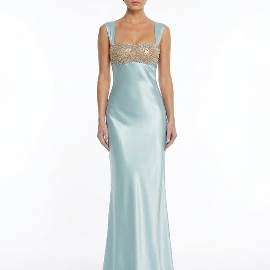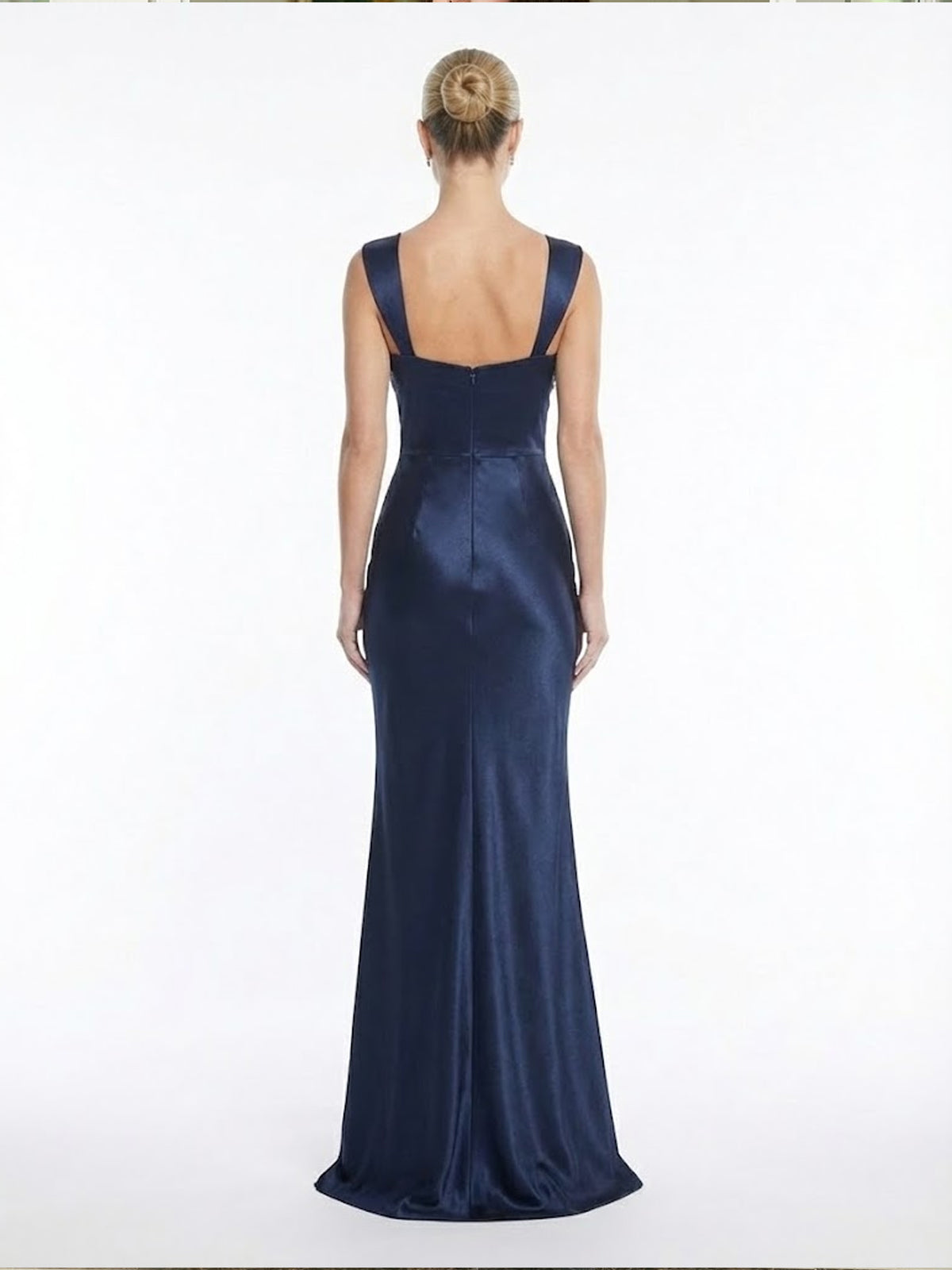 Elevate your evening in this sophisticated and lustrous creation. This piece features an intricate embroidered floral detail across the bust, perfectly complemented by a sleek square neckline and supportive wide straps. Crafted from a smooth material with a luxurious sheen, the silhouette flows into a graceful floor-length finish for a timeless, statuesque look.