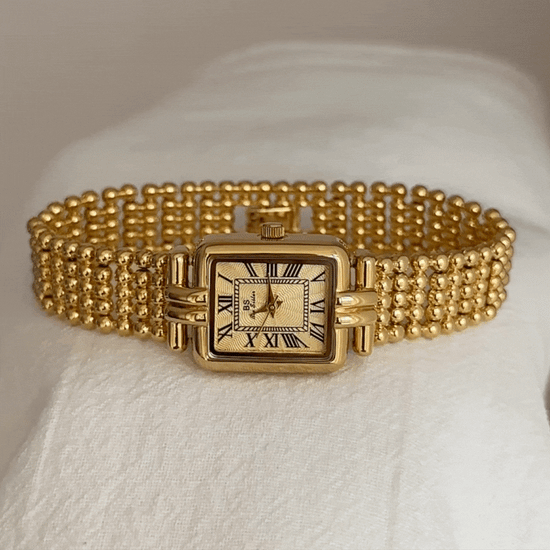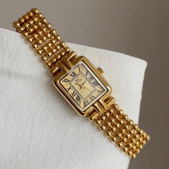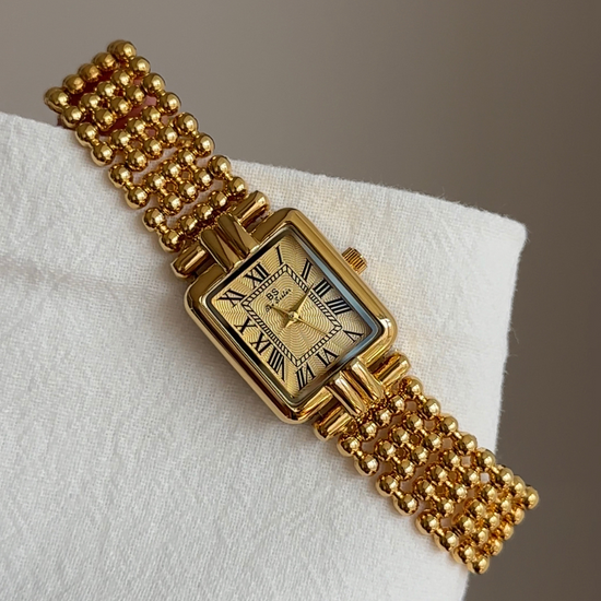 Versailles Bloom watch exudes French vintage romance with its exquisite gold-tone beaded bracelet and elegant rectangular dial featuring classic Roman numerals. This quartz timepiece blends antique charm with modern precision, creating a perfect statement accessory for both special occasions and everyday elegance.