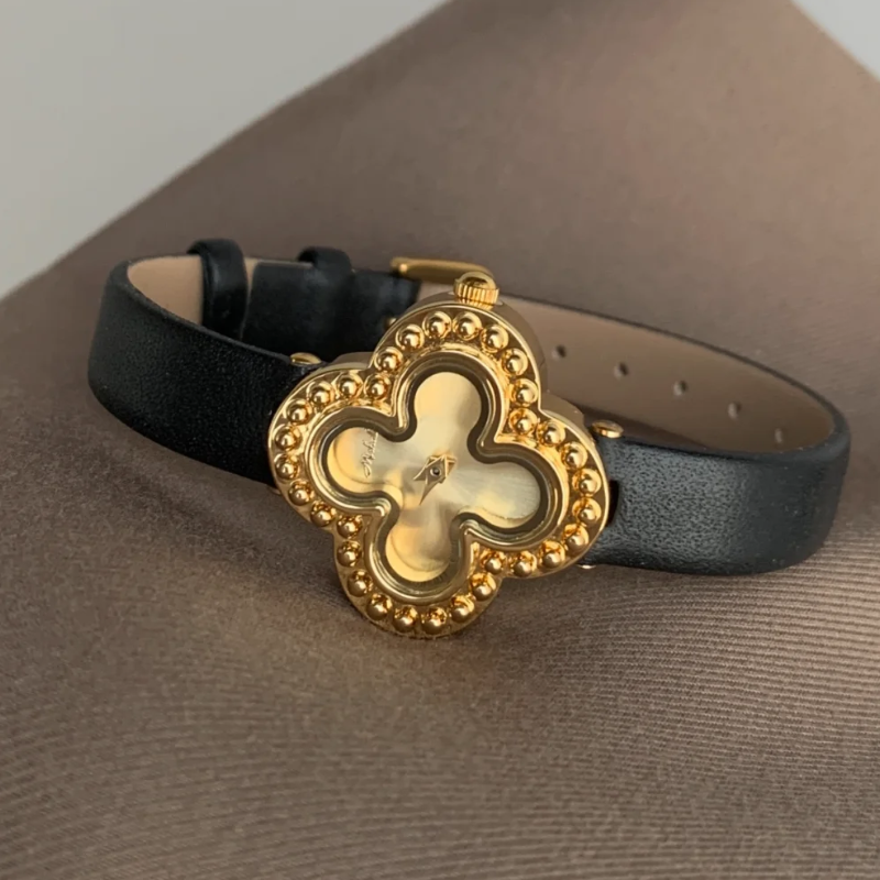 Dit quartzhorloge voor dames is voorzien van een kenmerkende klavervormige gouden kast, gecombineerd met een soepele zwarte echte leren bandHet klavertjevier symboliseert geluk en elegantie, terwijl het minimalistische ontwerp ervoor zorgt dat het moeiteloos met elke outfit te combineren is, of het nu voor werk of een avondje uit is.