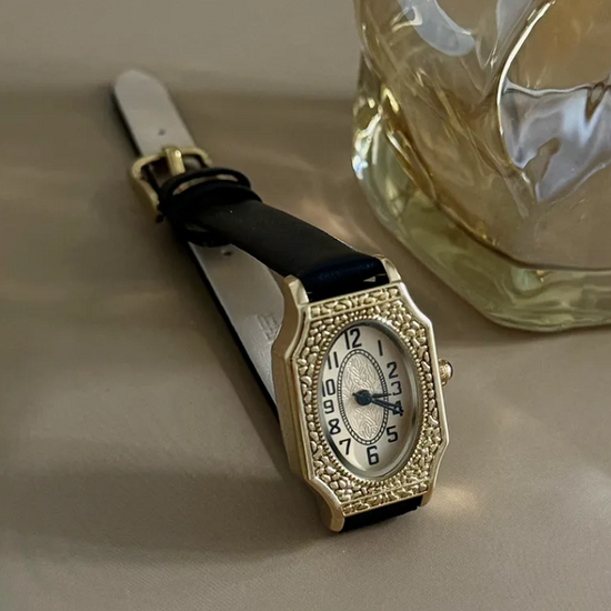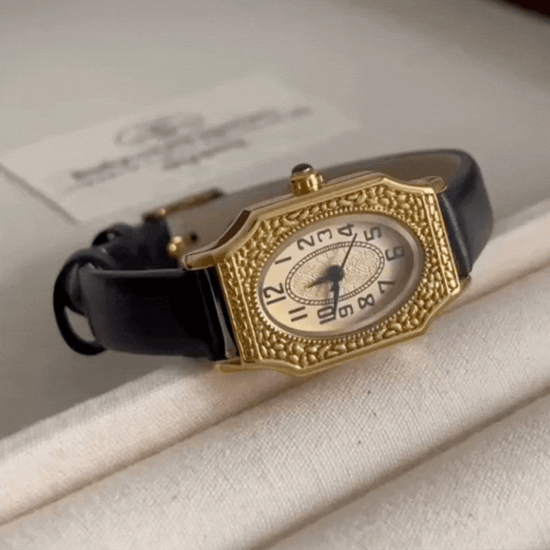 Geïnspireerd door klassieke olieverfschilderijen en barokke lijsten, is dit quartzhorloge voor dames voorzien van een fijn gegraveerde goudkleurige kast, het inlijsten van een minimalistische wijzerplaat, en gecombineerd met een strakke zwarte echte leren bandElke ronding en elk detail ademt vintage vakmanschap – perfect voor wie houdt van tijdloos design met een verhaal.