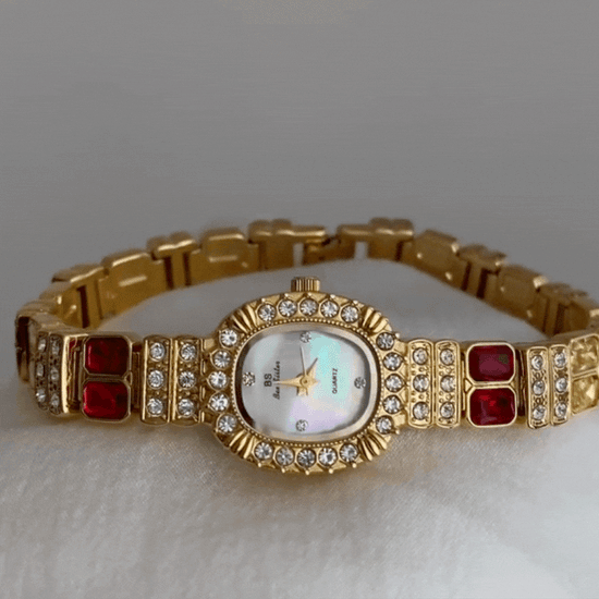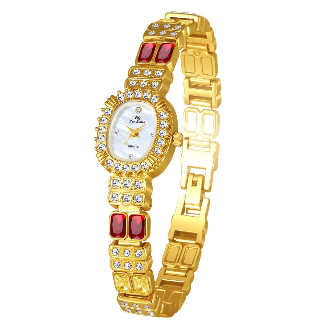 Elegant women’s quartz watch with gold bracelet design, oval white dial, and ruby starry sky accents, offering vintage charm and refined luxury.