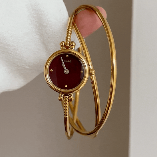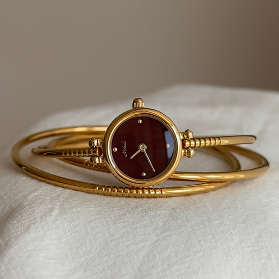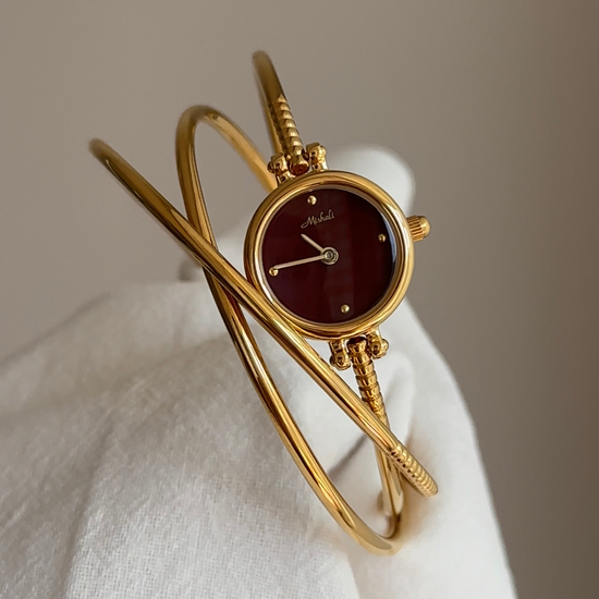 Elegant women’s quartz watch with gold multi-layer bangle bracelet and red round small dial, blending vintage chic with bold feminine charm.