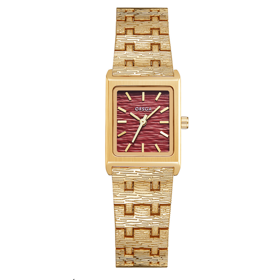 Stylish women’s quartz watch with gold ripple bracelet strap and square red dial, blending vintage chic with bold, refined elegance.
