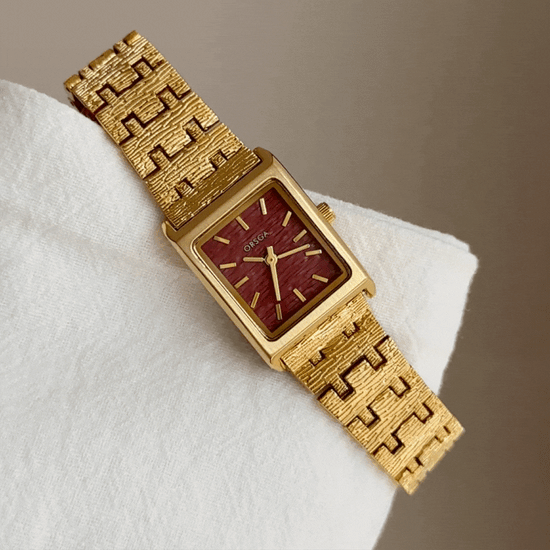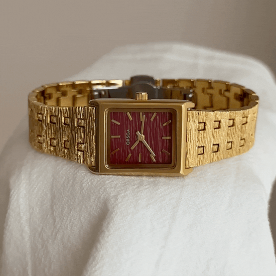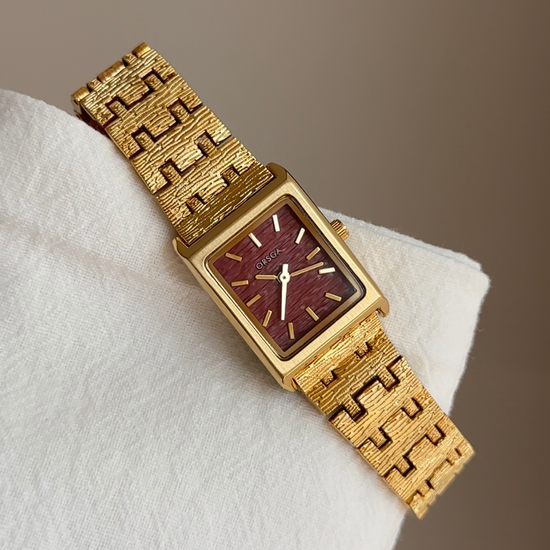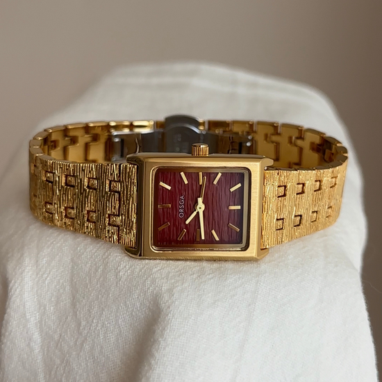 Gold Women Quartz Watch Ripple Bracelet Strap Square Red Dial Vintage Chic Style – Garnet