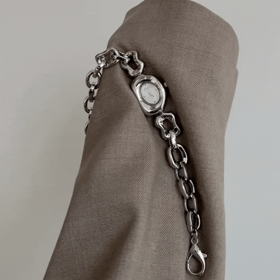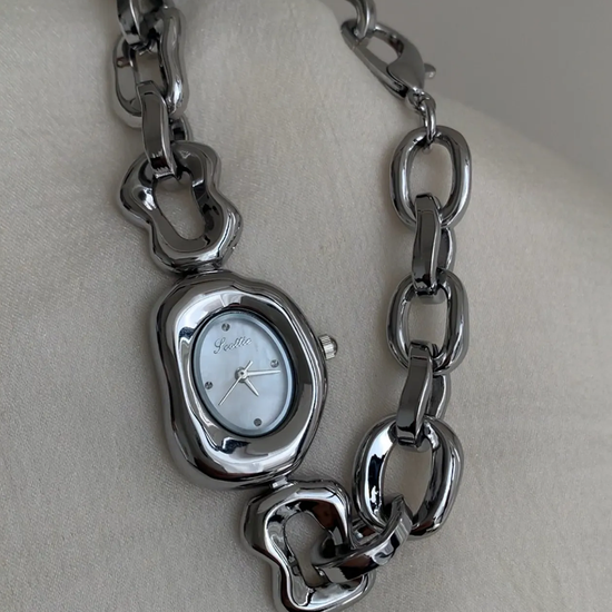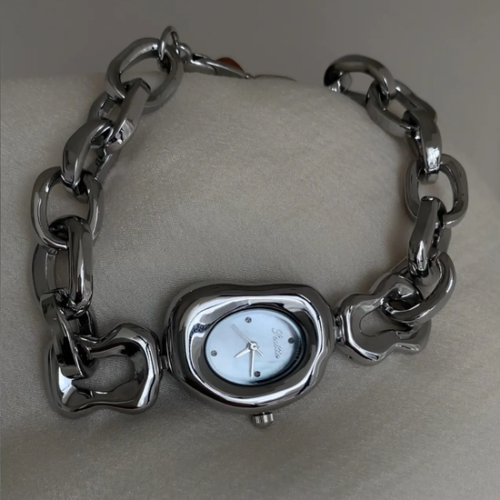 Dit subtiele, gedurfde quartzhorloge voor dames combineert natuurlijke elegantie met moderne kunst. Een lichtgevende witte parelmoer wijzerplaat vangt bij elke beweging het licht, terwijl de sculpturale zilveren kettingarmband omhult de pols met stille verfijning.