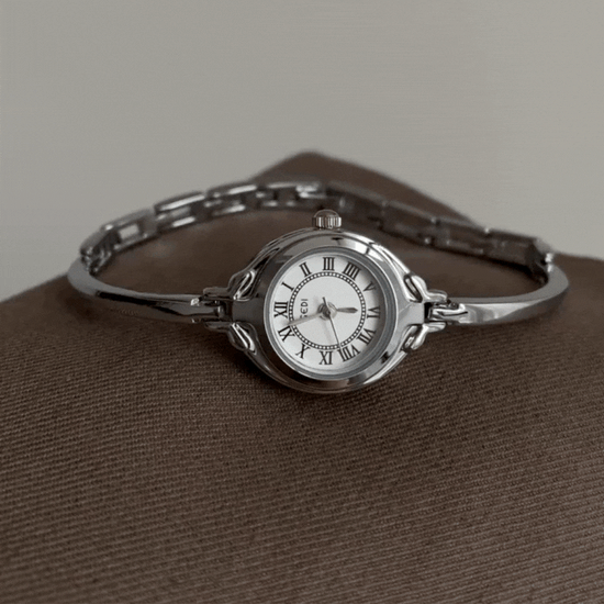 Dit quartzhorloge voor dames is voorzien van een kleine witte ronde wijzerplaat in een strak vormgegeven zilveren armband in bangle-stijl, wat de perfecte balans creëert tussen een horloge en een verfijnd accessoire. Het slanke profiel en het op sieraden geïnspireerde ontwerp maken het een ideale keuze voor elegante laagjes of solo.