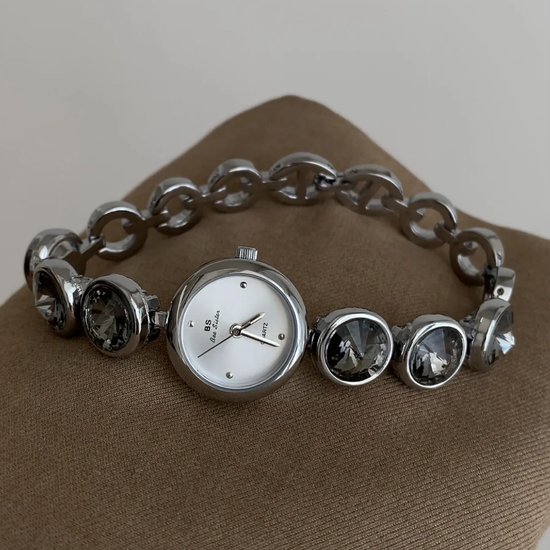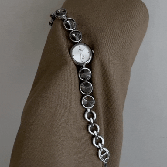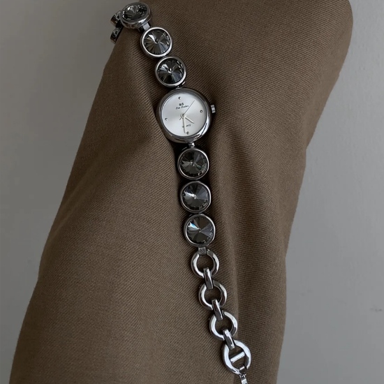 Delicaat maar toch gedefinieerd, dit dameshorloge met armband combineert een kleine ronde wijzerplaat met een strakke ketting versierd met zwarte kristallen accenten, met precies de juiste vleugje verfijnde sprankeling. Ontworpen voor wie subtiele elegantie waardeert, draagt het als een sieraad en geeft het de tijd met stille precisie aan.