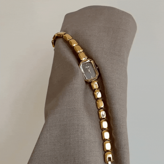 Dit quartzhorloge voor dames is voorzien van een strakke zwarte rechthoekige wijzerplaat, omlijst in warm goud en gecombineerd met een opvallende kralenkettingarmband Dat subtiele textuur en charme toevoegt. De minimalistische wijzerplaat en strakke lijnen zorgen voor een moderne, zelfverzekerde look, terwijl de armband een door sieraden geïnspireerde elegantie uitstraalt.
