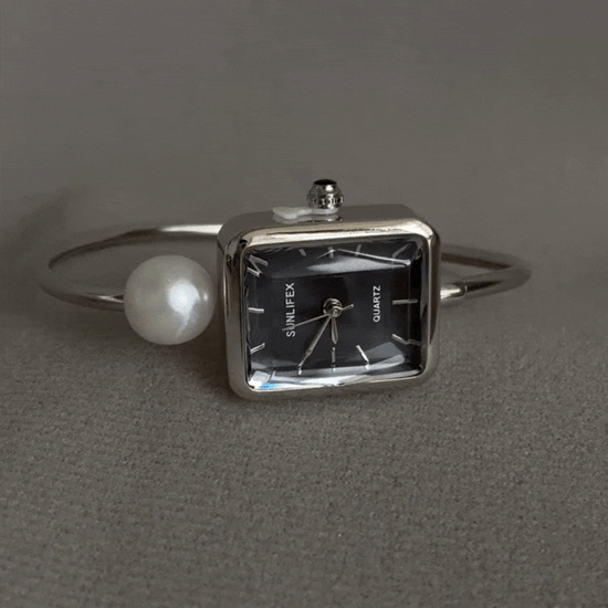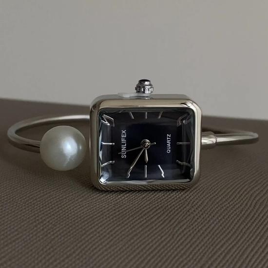 Dit quartzhorloge voor dames is voorzien van een strakke zwarte rechthoekige wijzerplaat, gehuisvest in een gepolijste zilveren armband in bangle-stijl, delicaat ingelegd met parelsHet samenspel van donkere tinten en lichtgevende parelaccenten creëert een look die elegant, modern en moeiteloos verfijnd.