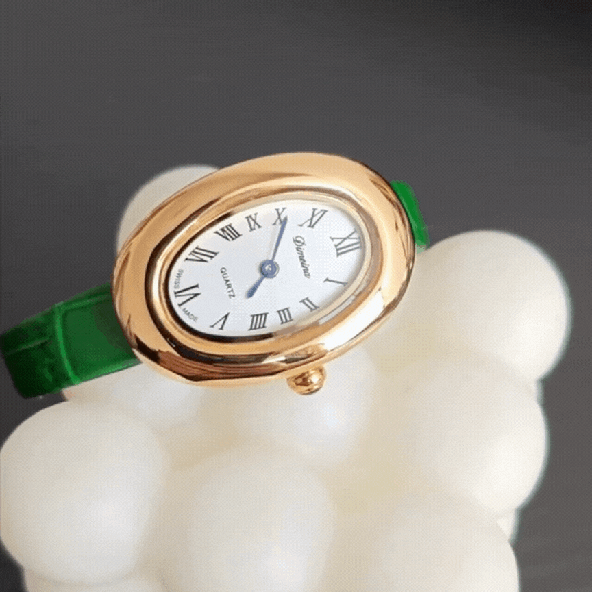 Dit quartzhorloge voor dames combineert een klassieke witte ovale "badkuip" wijzerplaat met een verfijnde groene echte leren band, wat een look creëert die zowel delicaat als onderscheidend is. Het subtiele silhouet wordt in evenwicht gehouden door de rijke kleur van de band – een moeiteloze mix van vintage charme en modern minimalisme.