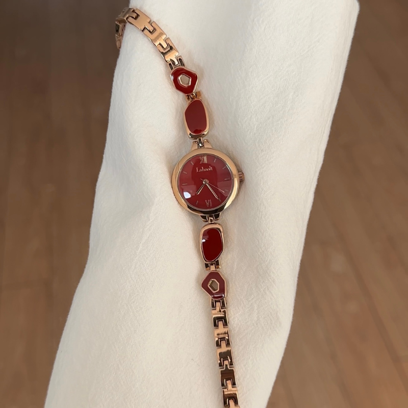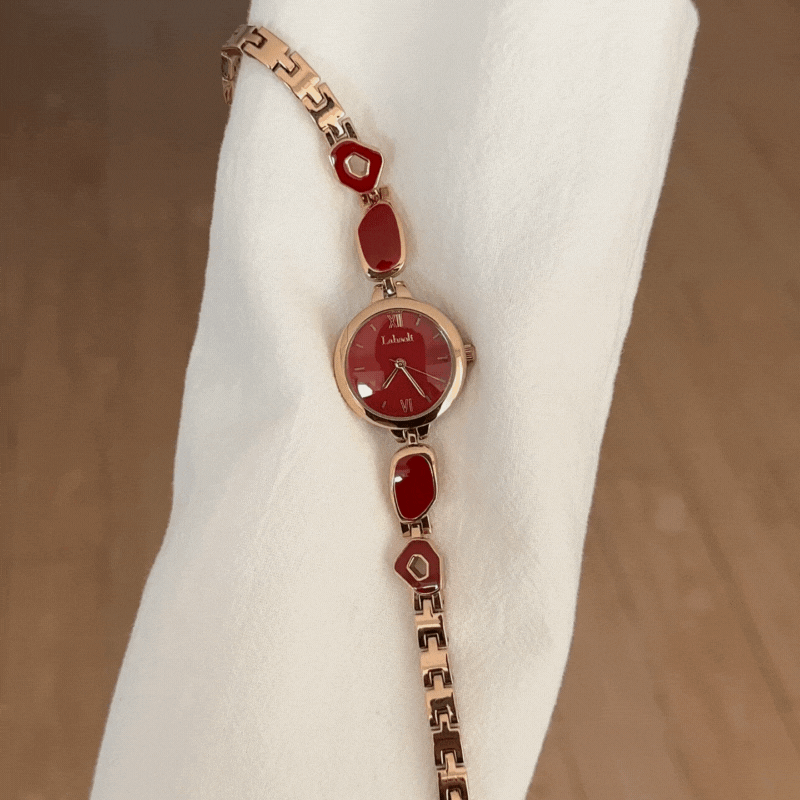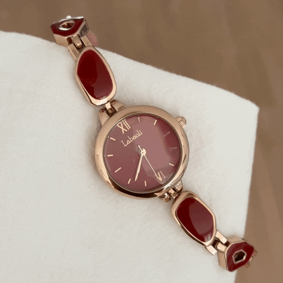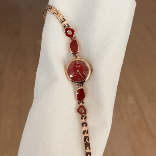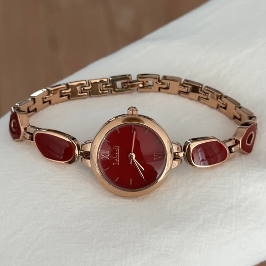 The Roselle Gem watch radiates refined elegance and feminine charm. Crafted in rose gold tones, it features a bracelet-style design delicately inlaid with gemstones, paired with a lustrous red dial that glows with confidence and sophistication. Perfectly balancing jewelry aesthetics and precise timekeeping, this watch is a timeless piece that elevates any outfit — from casual elegance to formal occasions.