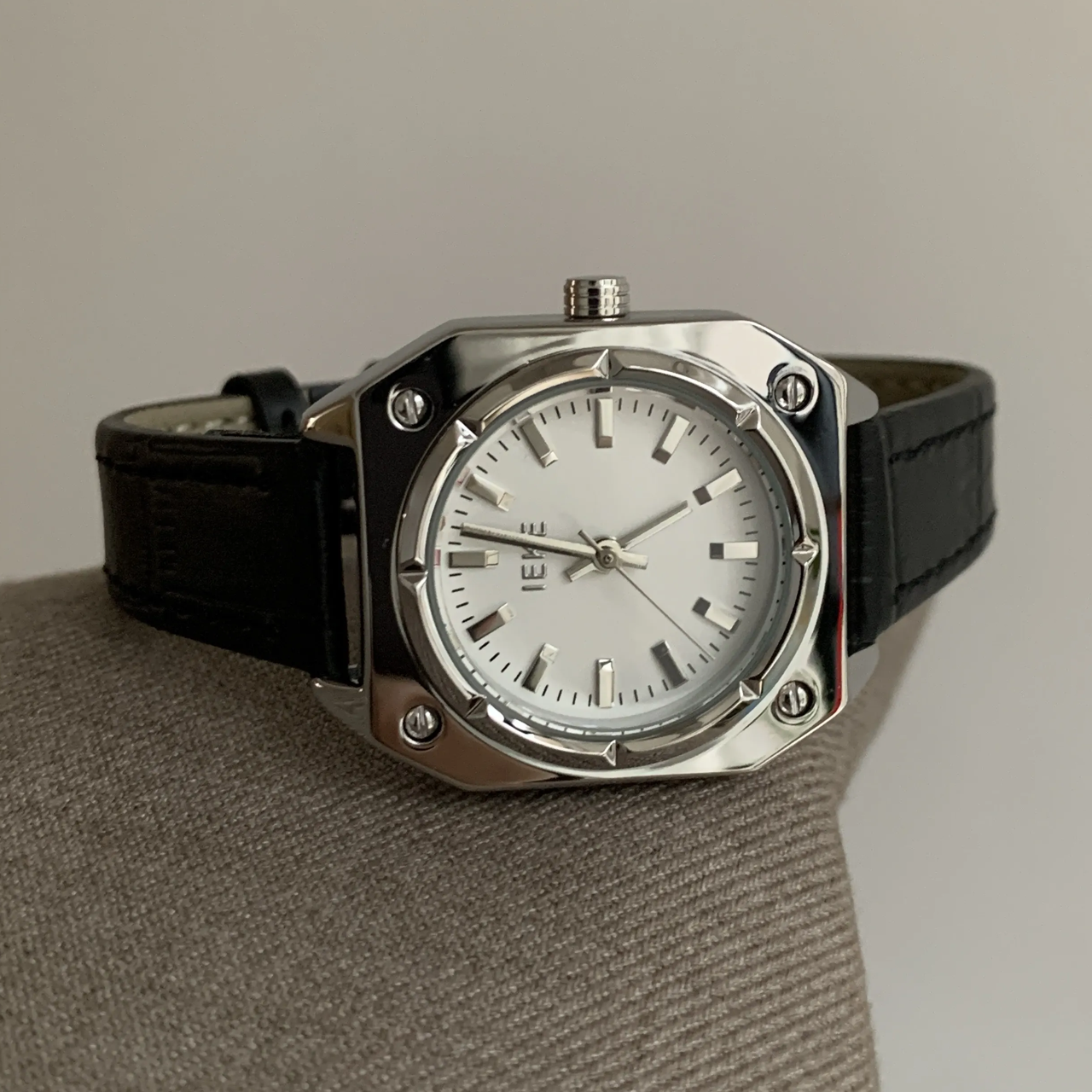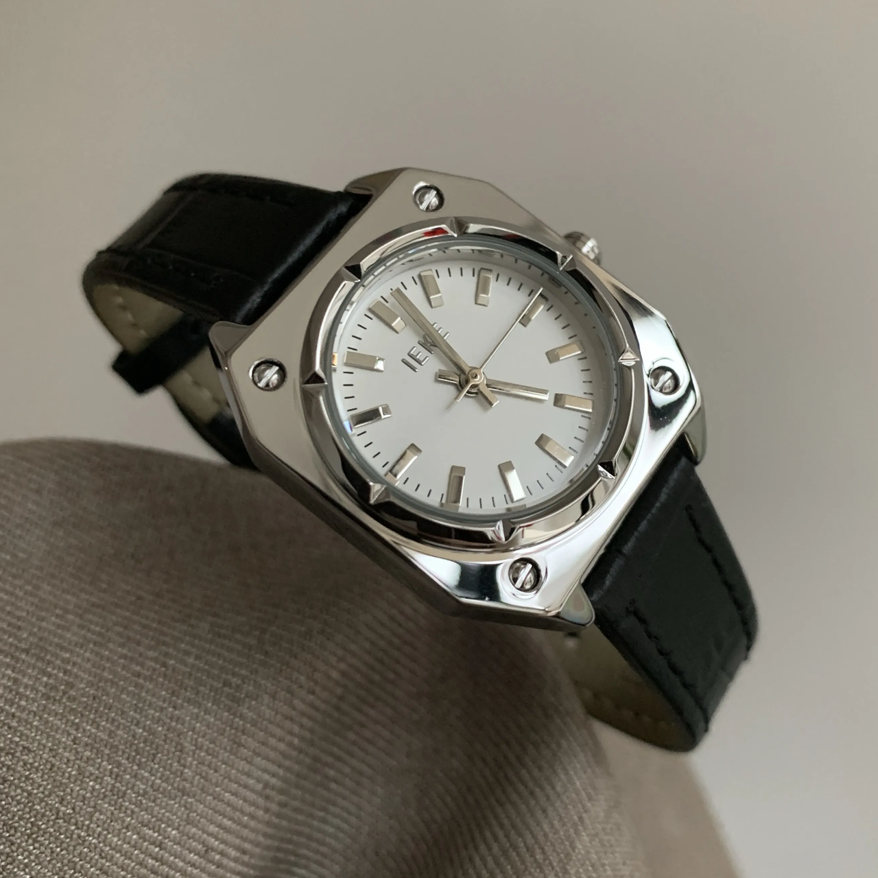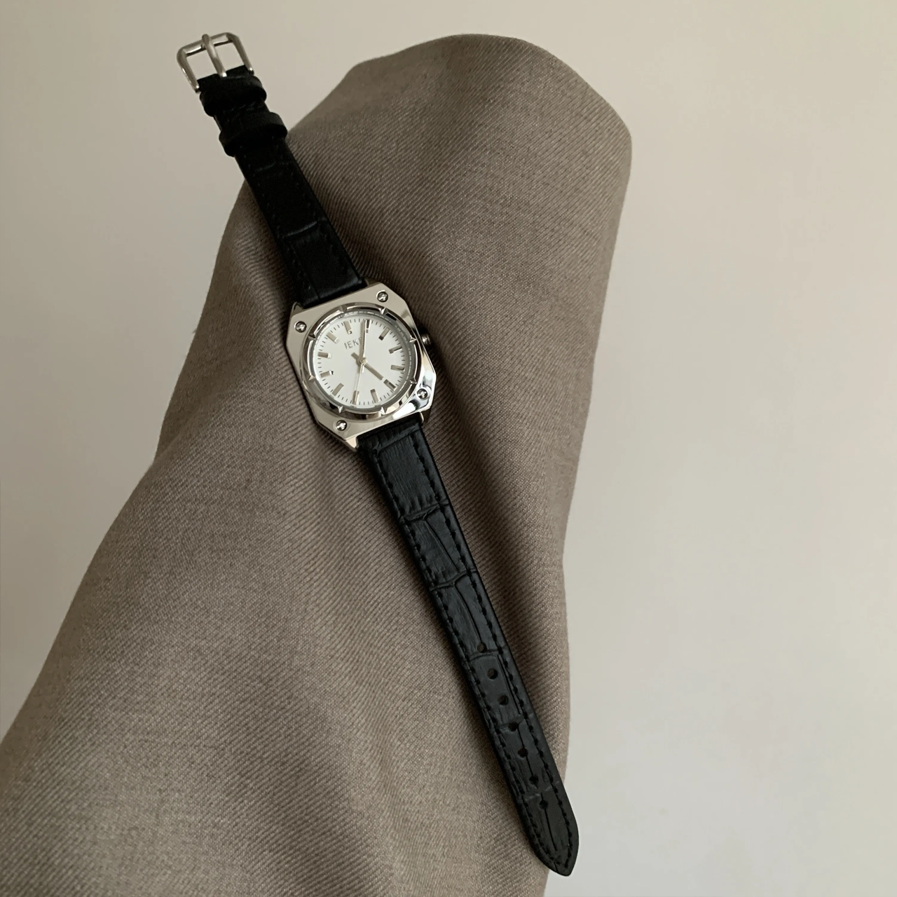 Slank elegantie -uurwerk: zwart lederen zilveren kast witte wijzerplaat