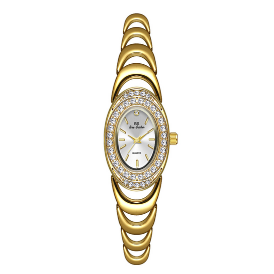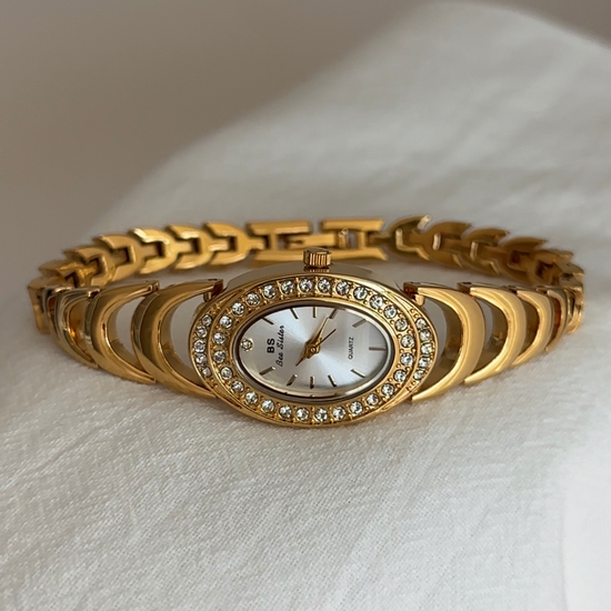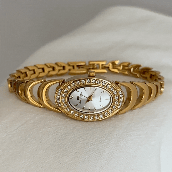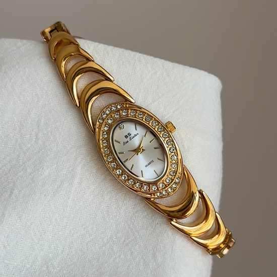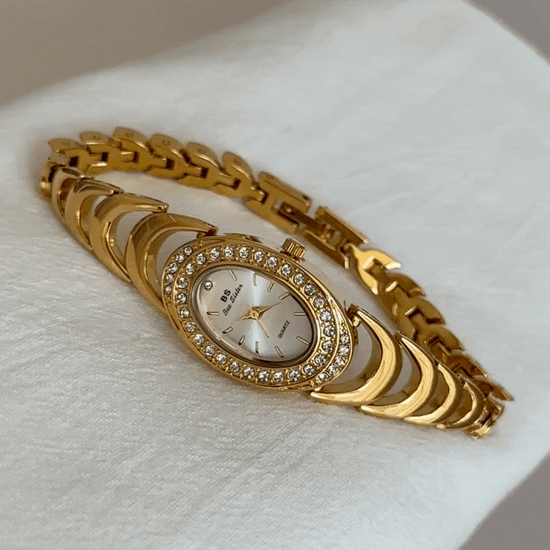 Gilded Sapphire watch exudes vintage luxury with its intricate gold bracelet-style design and elegant oval diamond-accented round dial. This quartz timepiece combines opulent craftsmanship with modern precision, creating a dazzling statement piece for discerning women.