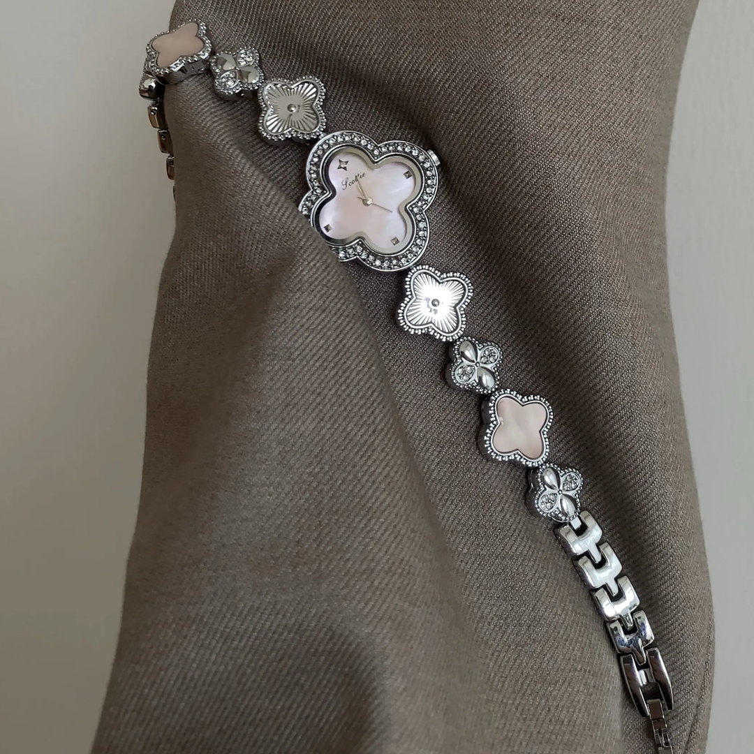 Dit elegante quartzhorloge is voorzien van een delicate roze parelmoeren klavervormige wijzerplaat, prachtig gecombineerd met een strakke zilveren armbandband. Ontworpen voor verfijning en veelzijdigheid, het biedt nauwkeurig quartz-uurwerkwaardoor het het perfecte accessoire is voor elke gelegenheid.