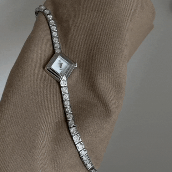 Dit prachtige quartzhorloge is voorzien van een witte ruitvormige wijzerplaat en een zilverkleurige armband versierd met fonkelende diamanten, een combinatie van elegantie en verfijning. Met nauwkeurig quartz-uurwerk en een tijdloos design, het is het perfecte accessoire voor zowel professionele als speciale gelegenheden.