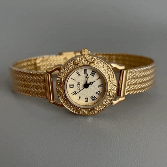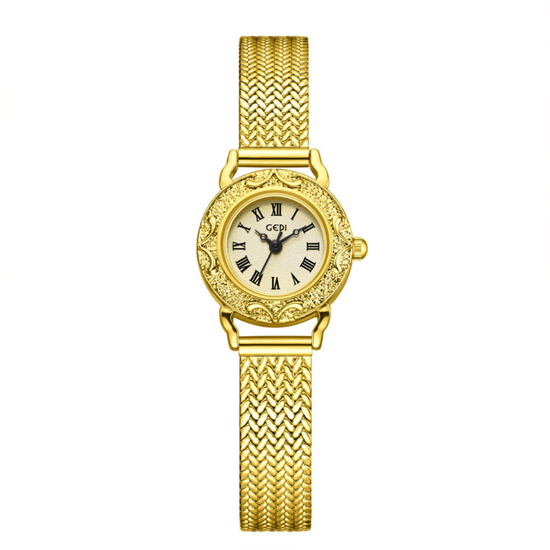 Denne kvartsklokken for kvinner er en hyllest til gammeldags eleganse, med en skulpturert gullfarget urkasse med delikat preging, kombinert med en tidløs hvetelenkearmbåndHver detalj vitner om raffinert håndverk – et smykke som føles mer som vintage-smykker enn en klokke.