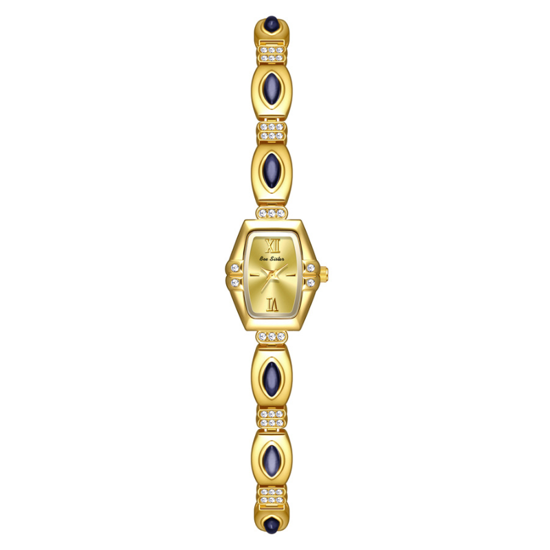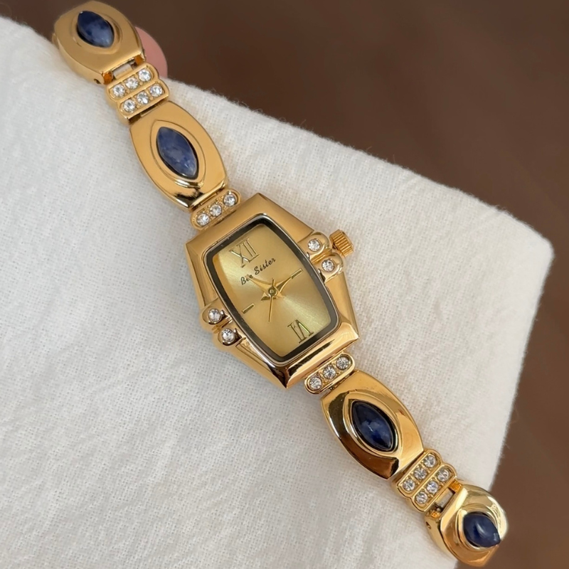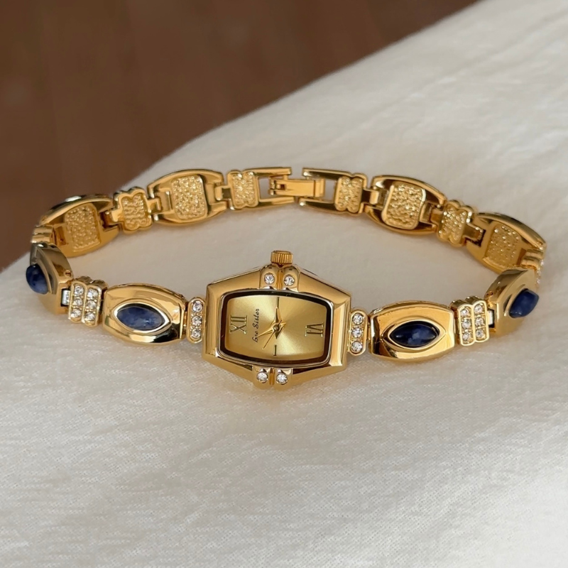 Elegant Vintage Watch with Gold Dial, Blue Gemstone Accents & Alloy Bracelet, Quartz Movement