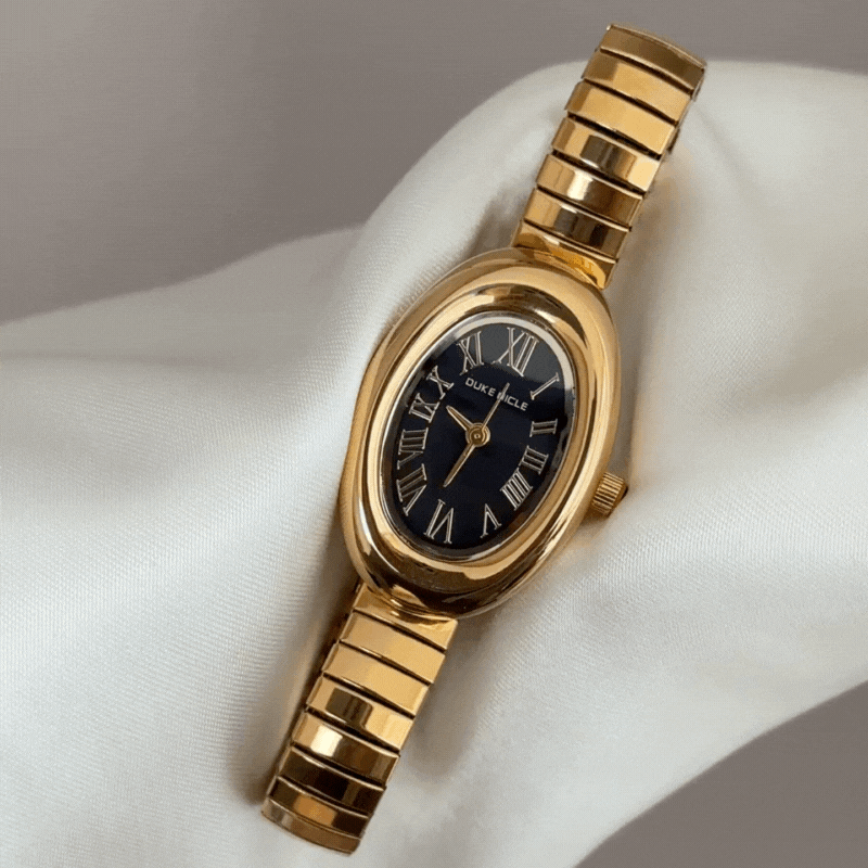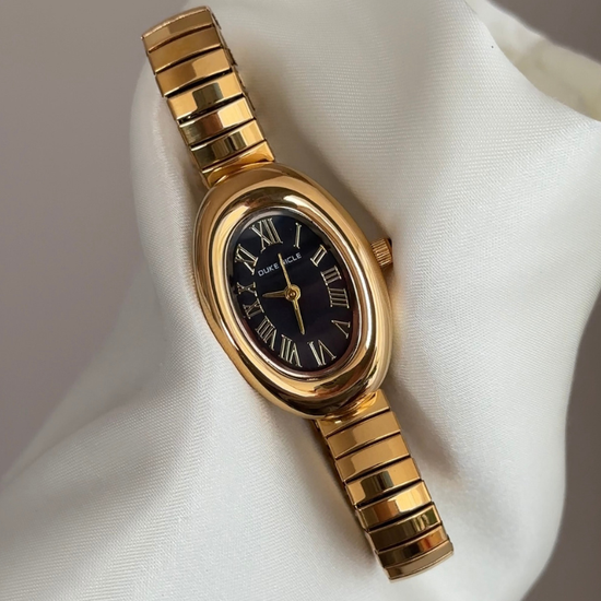 This elegant women’s quartz watch features a gold-tone stretch bracelet and a mini black oval dial. The sleek contrast creates a refined, timeless look, while the flexible band ensures comfortable everyday wear. Finished with a precise quartz movement, it’s a versatile accessory for both casual and formal styling.