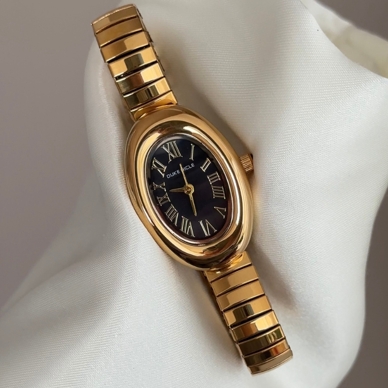 Gold Stretch Bracelet Women’s Quartz Watch – Mini Black Oval Dial