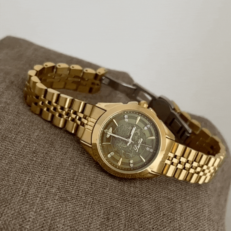 Denne kvartsklokken for kvinner har en livlig grønn rund urskive, plassert i en polert gullfarget deksel, og parret med en klassisk gulllenkearmbåndInspirert av vintage-silhuetter, blander den dristige farger med tidløst metall – perfekt for å lage et subtilt, men selvsikkert uttrykk.