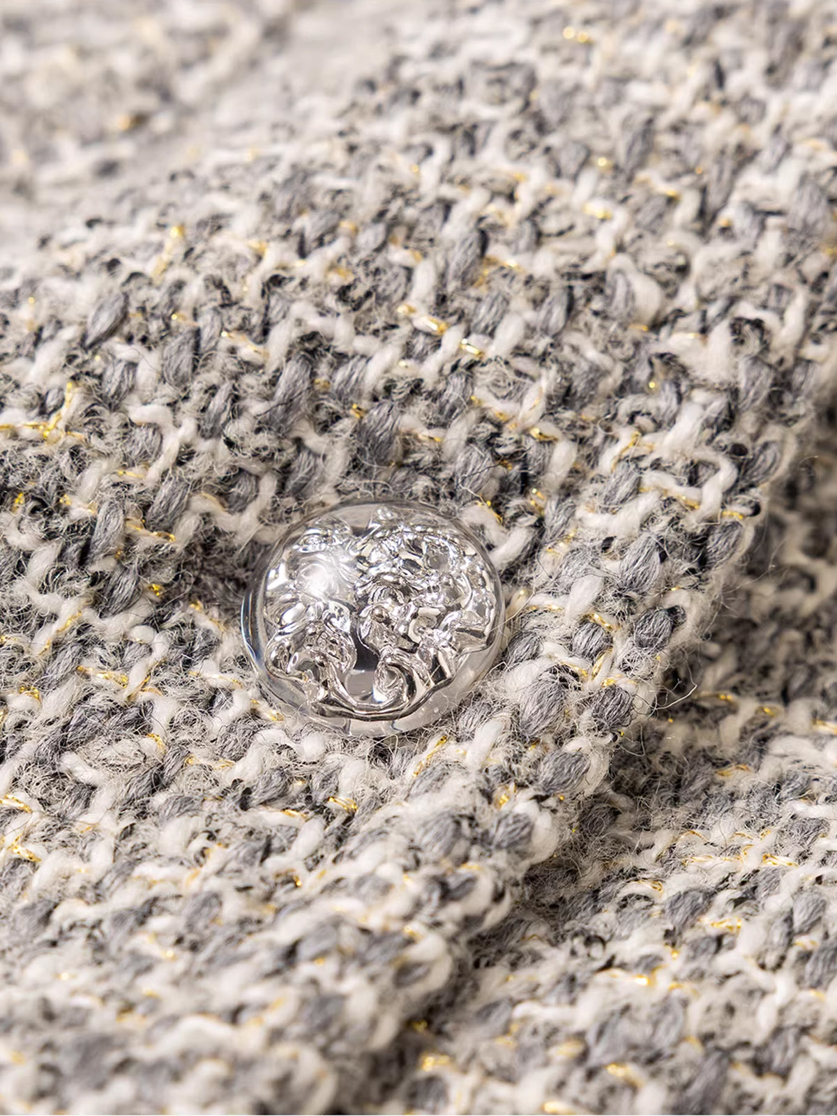- Sophisticated collarless round-neck design accented with textured, artisanal round buttons to serve as a bold, editorial focal point.