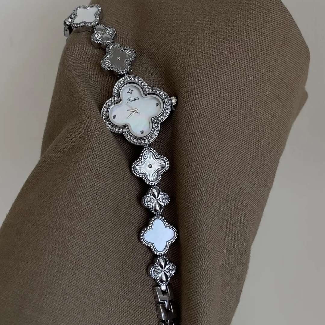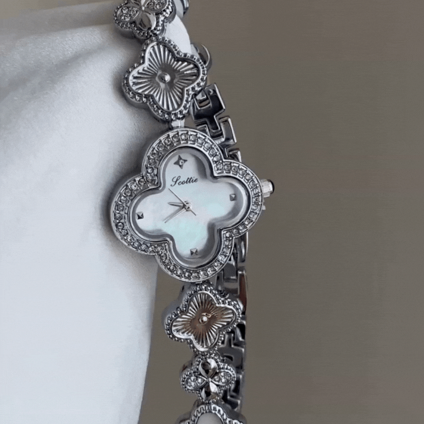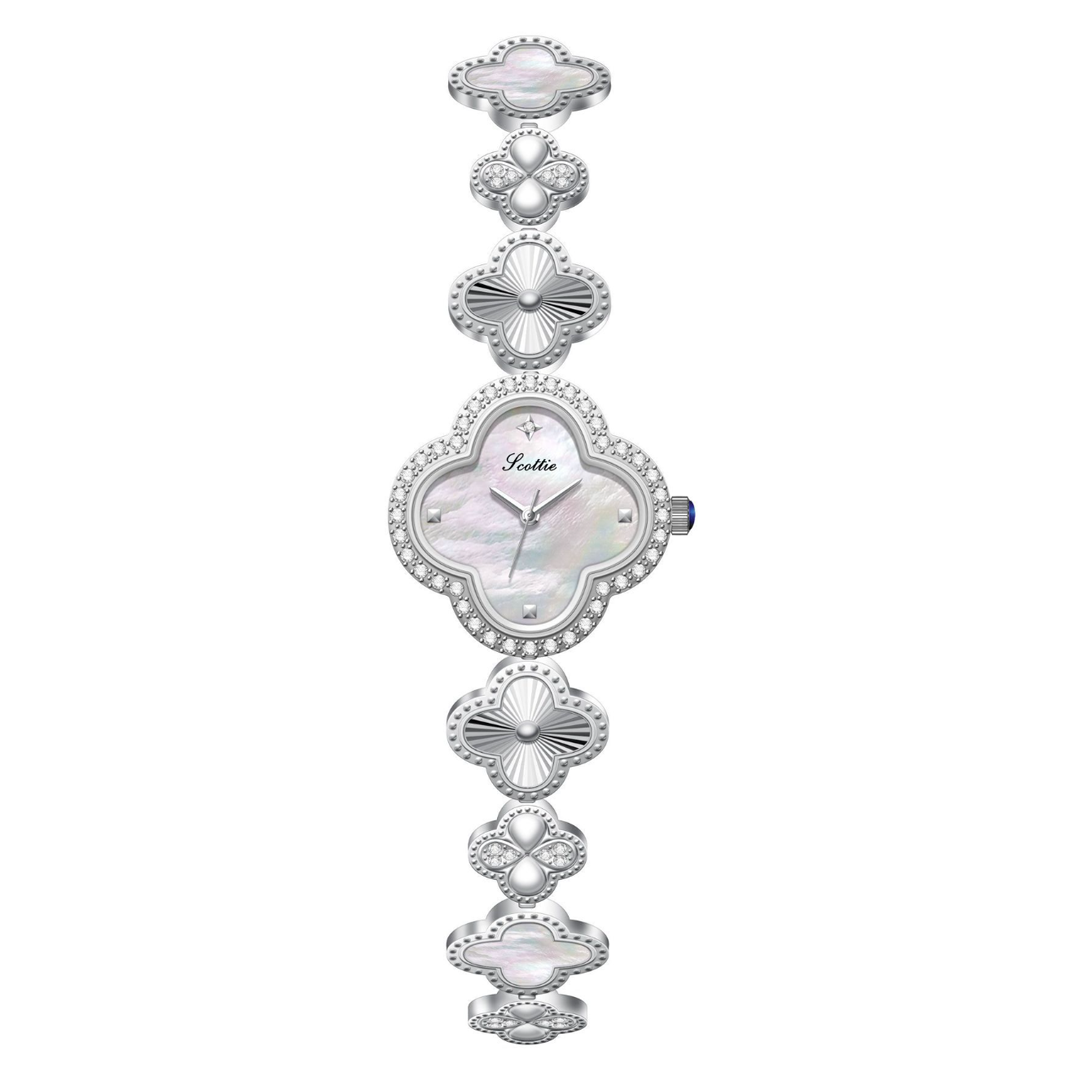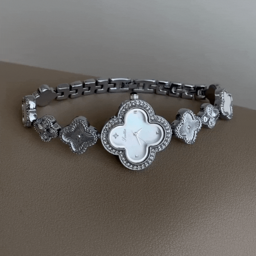 Denne kvartsklokken for kvinner har en lysende hvit perlemorskive utsmykket med en delikat firkløvermotiv og glitrende krystalldetaljer. Matchingen sølvkløverformet armbånd forsterker den romantiske sjarmen, og gir det følelsen av et fint smykke.