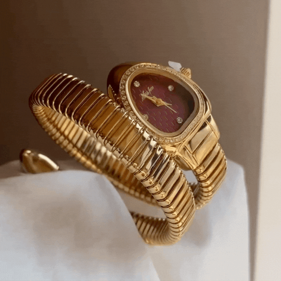 Denne damekvartsklokken er designet for å gjøre et inntrykk, og har en gullfarget slangehode-etui, sammen med en spiralformet armbånd som slynger seg elegant rundt håndleddet. teksturert slangemønsterskive tilfører dybde og intrige, og gjenspeiler slangens mystikk og tidløse symbolikk for makt, gjenfødelse og femininitet.