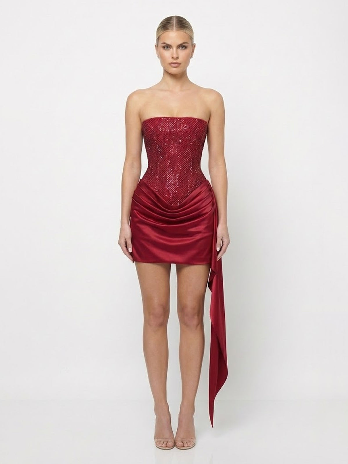 Steal the spotlight in this high-octane and expertly tailored creation. This piece features a structured corset bodice heavily adorned with shimmering beads and sequins to catch every light, paired with a classic strapless neckline. Luxurious fabric drapes across the hips for a flattering, gathered look, extending into a dramatic side sash that adds a touch of couture flair. The reverse showcases a traditional lace-up closure, ensuring a perfectly snatched fit and a sophisticated silhouette from every angle.