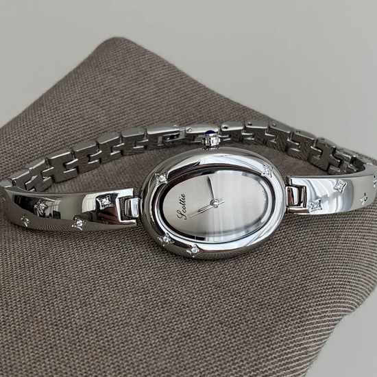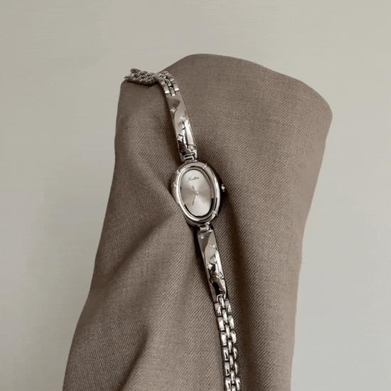 Denne damekvartsklokken er delikat og særegen, og har en skulpturert badekarformet urskive i en myk metallisk finish, utsmykket med graverte stjernedetaljer som glitrer subtilt når du beveger deg. Den gråtonet halv armring, halvkjedestropp tilfører arkitektonisk eleganse, og blander mykhet med struktur.
