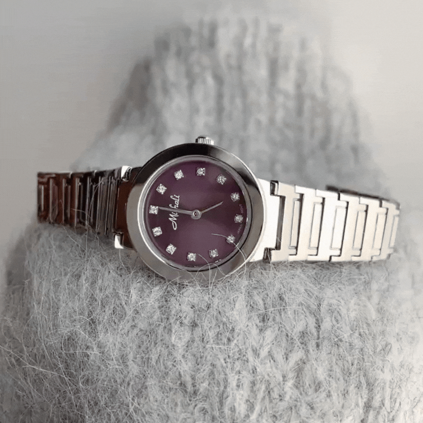 Tidløs sofistikering: Silver & Purple Round Dial rustfritt stål kvarts klokke