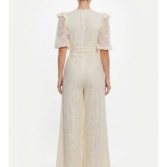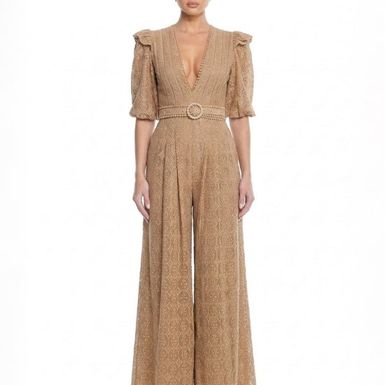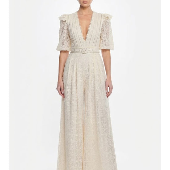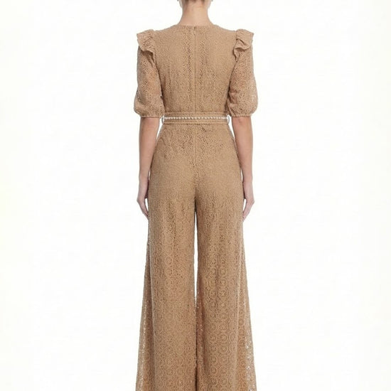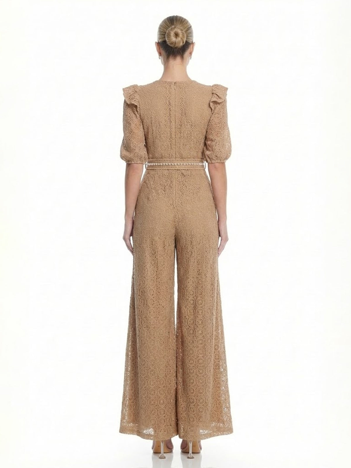 V-Neck Puff Sleeve Lace Jumpsuit with Belt