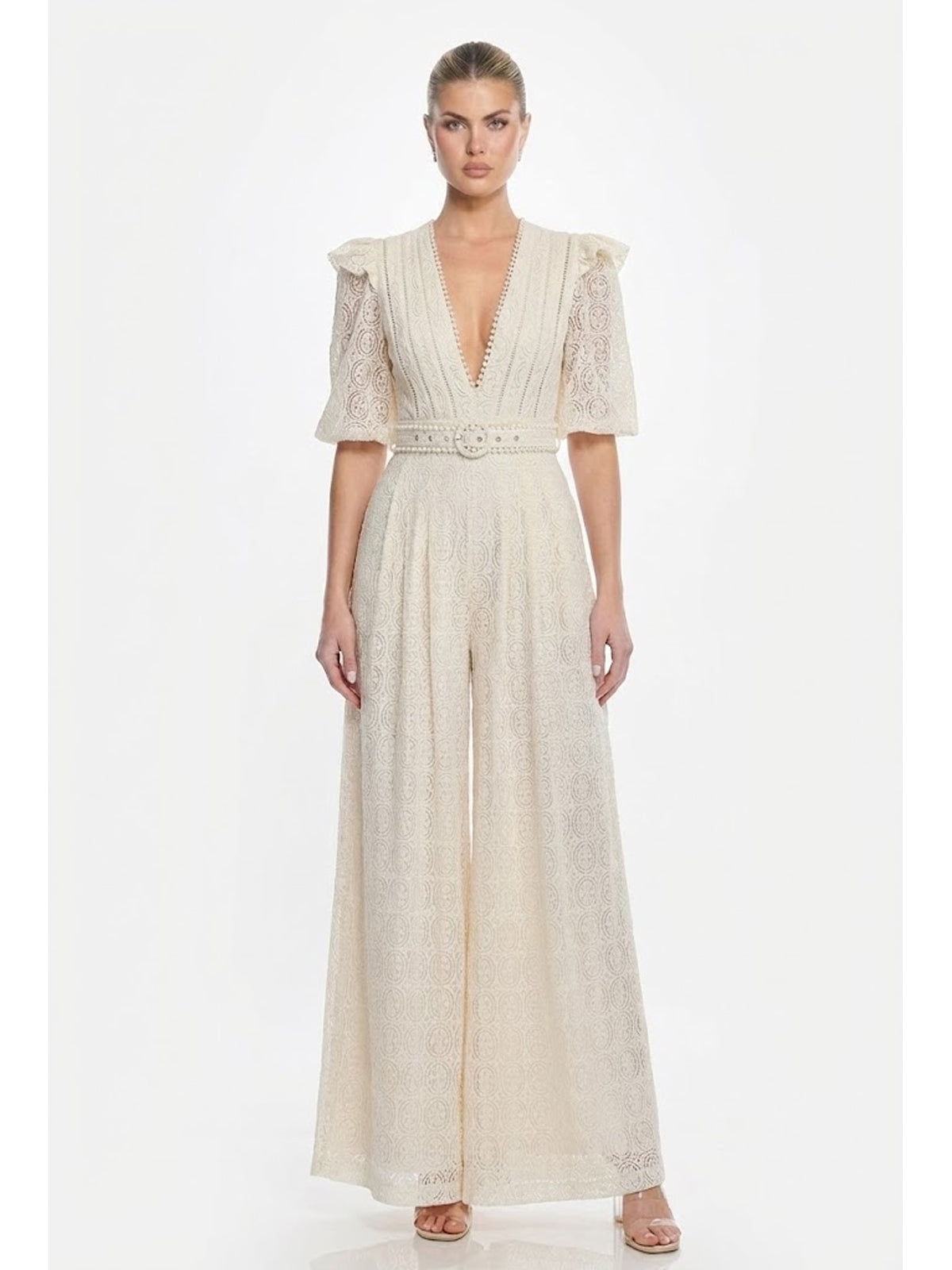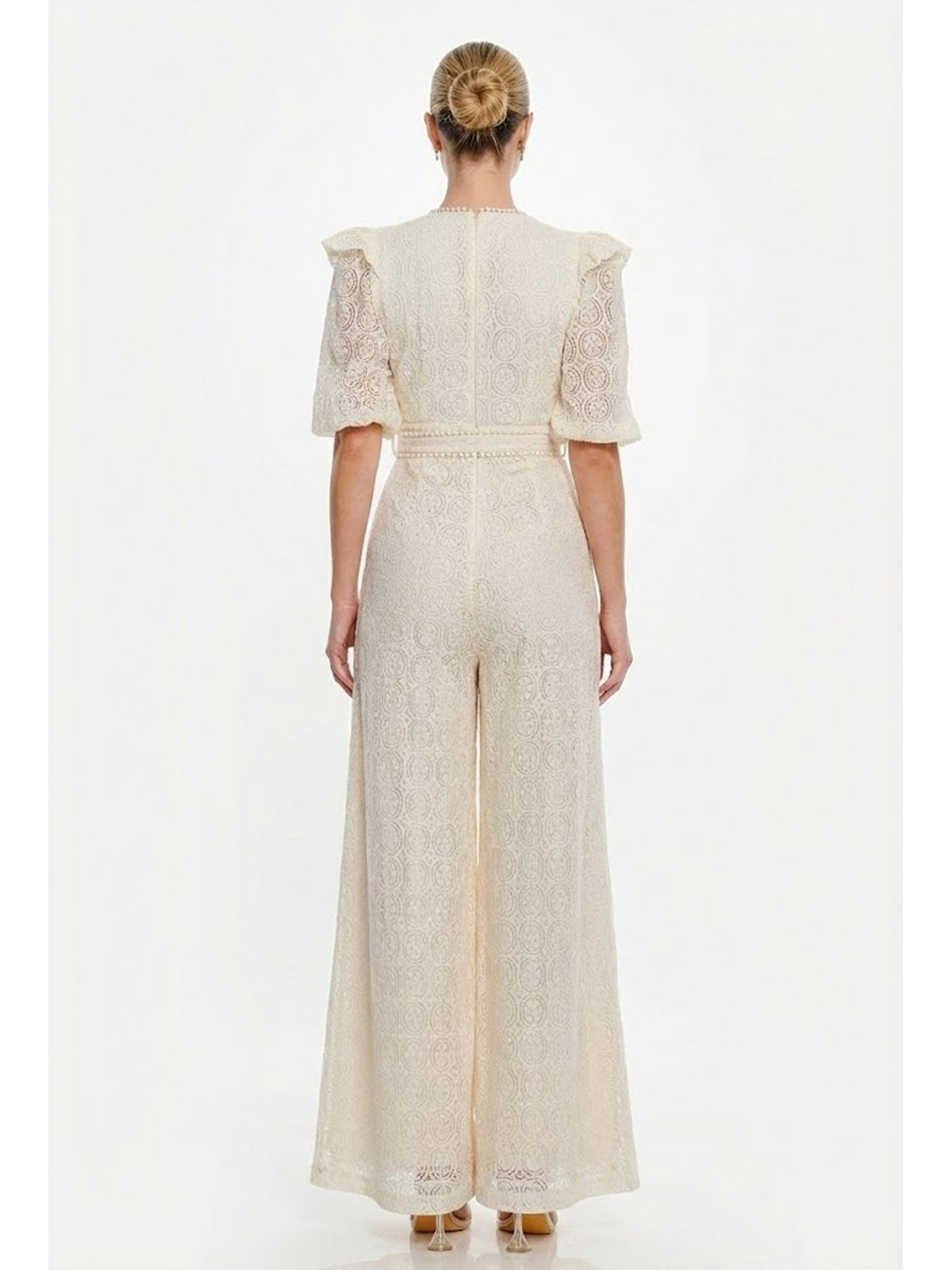 Effortlessly chic and sophisticated, this one-piece wonder is ready for your next event. Crafted from intricate geometric lace, it features a flattering deep V-neckline framed by stylish puff sleeves that add a touch of drama. The silhouette is defined by a matching belt with a round buckle that cinches the waist before flowing into breezy wide legs. The back offers a clean, full-coverage look that showcases the beautiful pattern of the fabric. It’s a stunning choice for garden parties, brunches, or summer soirées.