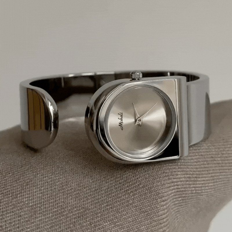 The Aeris Curve watch embodies modern minimalism and sculptural elegance. Designed with a wide silver bangle-style band and a petite round dial, it flows seamlessly like jewelry on the wrist. The clean lines and polished metal finish make it a statement of effortless sophistication — perfect for women who prefer artful simplicity over excess.