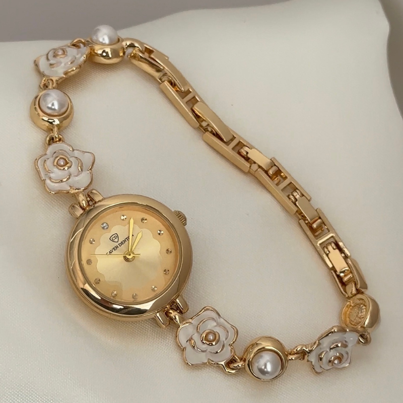 Antique Pearl Watch with Floral Pearl Bracelet and Gold Dial Quartz Movement