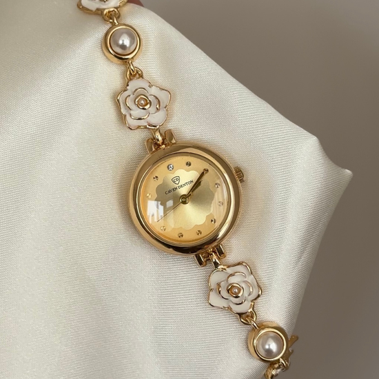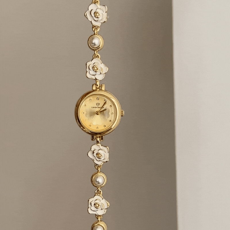 Embrace the exquisite fusion of enduring elegance and graceful femininity in our Floral Pearl Watch. This remarkable timepiece features a luminous golden dial, perfectly framed by a precision-crafted circular gold case, while its extraordinary bracelet masterfully blends gleaming pearls with sophisticated floral designs. Every detail converges in perfect harmony to create an exceptionally unique masterpiece that honors both timeless beauty and modern artistry.