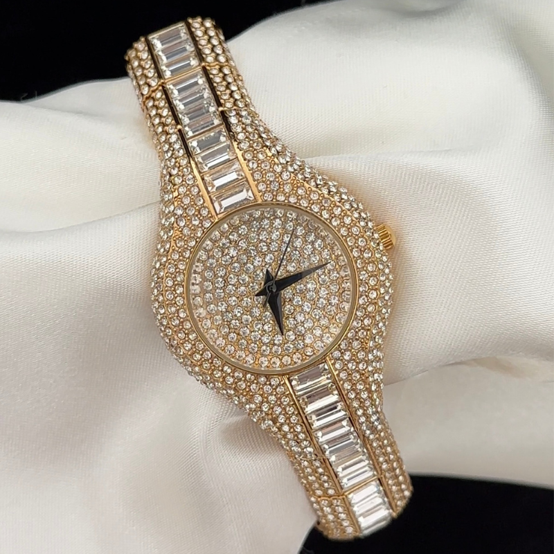 Radiating unparalleled luxury, this timepiece features a white dial fully paved with diamonds, set in a matching diamond-adorned gold bezel. The gold-tone alloy bracelet continues the diamond pattern with meticulously set stones. Precision quartz movement ensures accurate timekeeping.