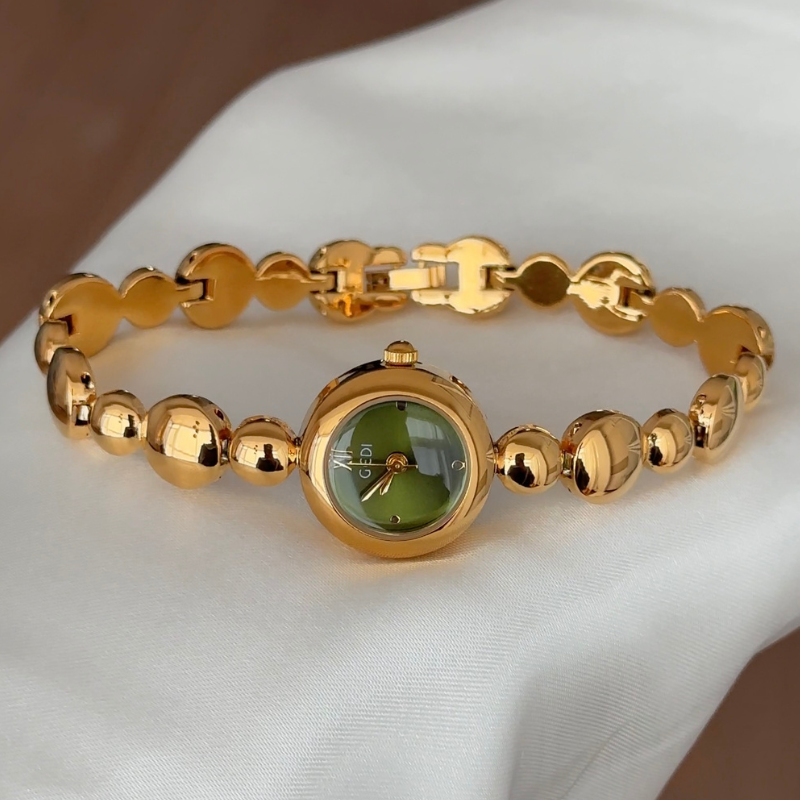 Chic Green Dial Watch - Gold Round Case & Beaded Alloy Bracelet