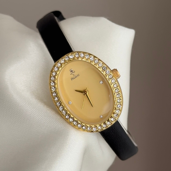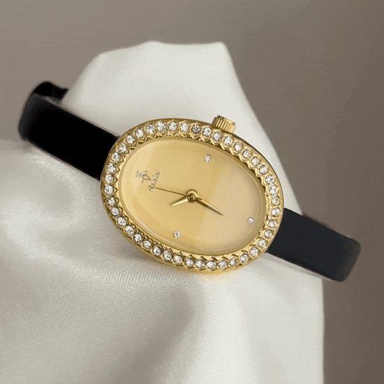 Classic Luxury Gold Oval Dial Watch – Gold Diamond Bezel & Black Leather Strap Quartz