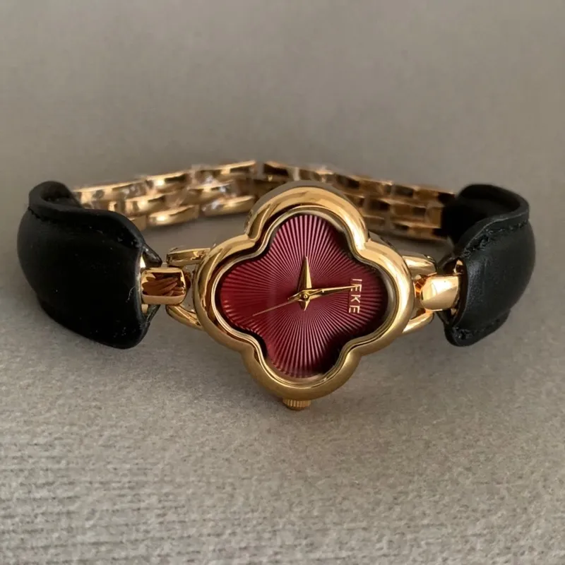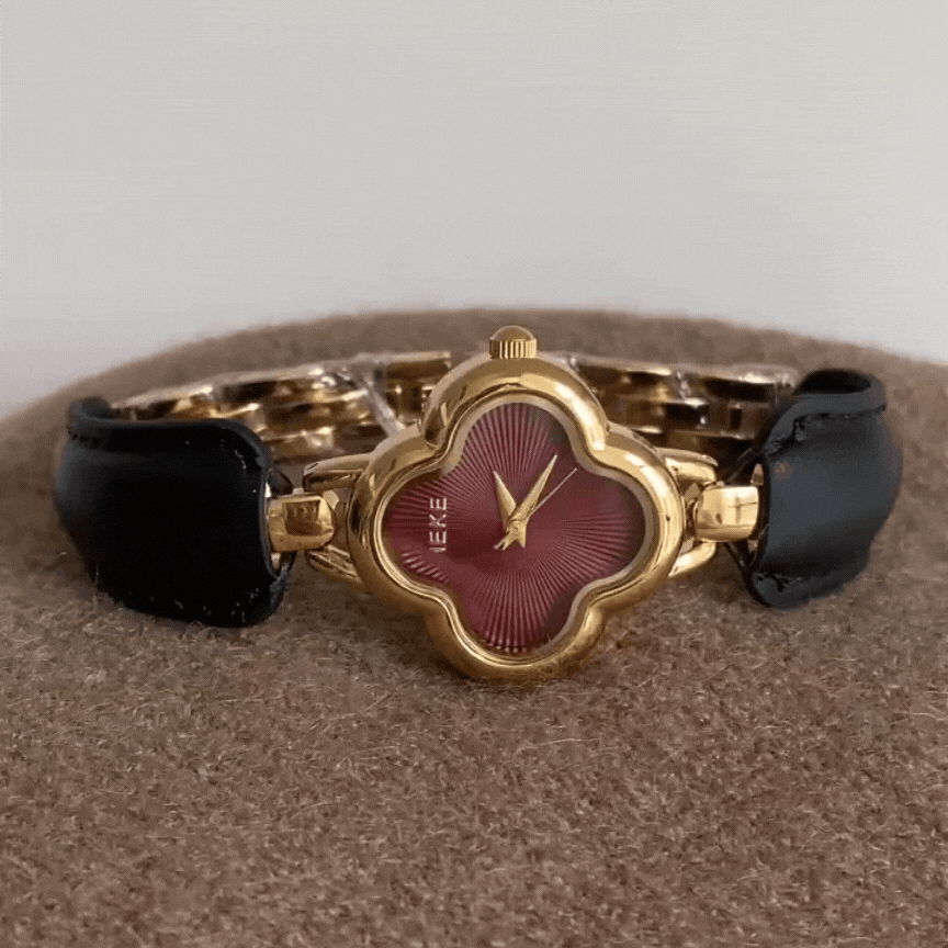 Introducing the Clover Red Timepiece, a bold fusion of charm and sophistication. This striking watch features a vivid red dial adorned with a delicate four-leaf clover design, symbolizing luck and elegance. Paired with a classic black leather strap, it offers both comfort and style. The minimalist quartz movement ensures precision, while the unique design adds a touch of individuality to your accessory collection. Perfect for those who seek a blend of timeless beauty and modern flair.