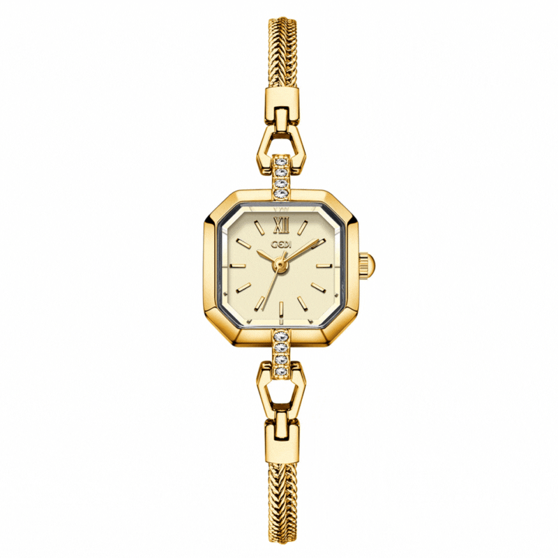 Charming and refined, this women’s quartz watch features a delicate gold bracelet design with a unique “sugar cube” inspired square case. Compact yet eye-catching, it blends elegance with playful sophistication, making it perfect for daily wear or special occasions. A stylish piece that adds a touch of luxury to any outfit.