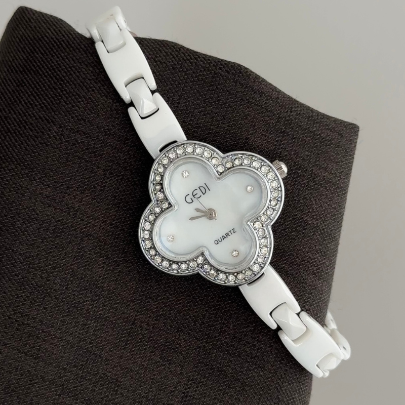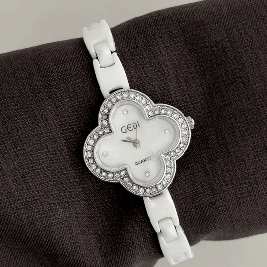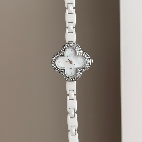 Lucky & elegant with a white clover dial, diamond-set silver bezel, and smooth white ceramic bracelet. Lightweight, hypoallergenic, powered by quartz—scratch-resistant & water-resistant for daily wear. A radiant symbol of grace for day to night—perfect as a cherished gift.