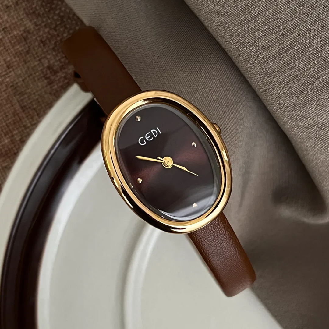 Refined and minimal, this women’s quartz watch features a slim latte brown strap paired with a polished oval gold case and a delicate small dial. Its elegant design blends subtle sophistication with modern style, making it a versatile accessory for work, casual days, or evening outings. A timeless piece that adds a graceful touch to any look.