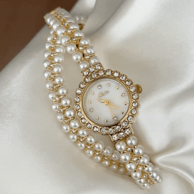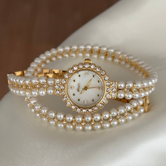 Celebrate timeless femininity with this masterfully crafted pearl watch, designed for modern women who cherish delicate luxury. It features a pristine white round dial set in a crystal-adorned gold bezel, flowing into a luminous wrapped pearl bracelet. Each hand-selected pearl radiates perfect luster, creating a sophisticated tribute to feminine grace. Precision quartz technology ensures reliable timekeeping with minimal care.