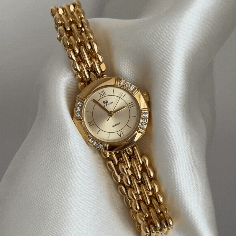 Embrace the timeless elegance of French design with our Vintage Gold Dial Watch. This exquisite timepiece features a radiant gold sunray dial with classic Roman numerals, encased in a unique gold octagonal frame adorned with brilliant diamond accents.