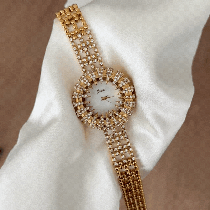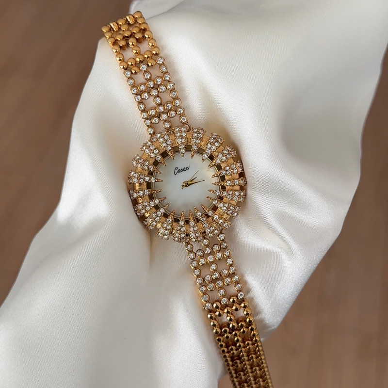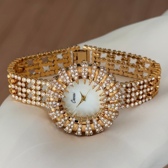 Exuding red-carpet elegance, this exquisite watch presents a diamond-paved white dial harmoniously framed by a matching gold bezel set with lavish diamonds. The gold-tone alloy bracelet extends this seamless diamond pattern, creating continuous sparkle throughout.